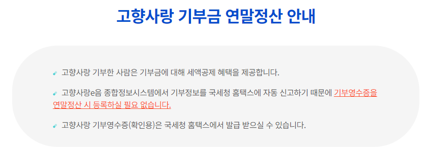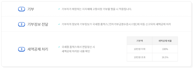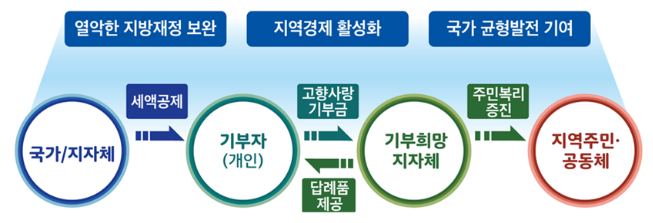 - 기부 주체 / 대상 : 개인 (법인 불가), 주민등록 주소지 외 전국 모든 지자체에 기부 가능