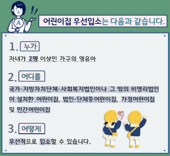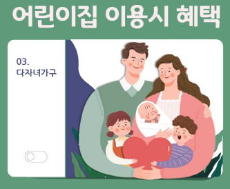 자녀가 2명 이상인 가구의 영유아는 어린이집을 우선적으로 입소할 수 있는 혜택을 제공합니다. 다자녀 가구의 어린이집 우선입소 기준에 대해서는 복지로 홈페이지에서 확인할 수 있습니다.