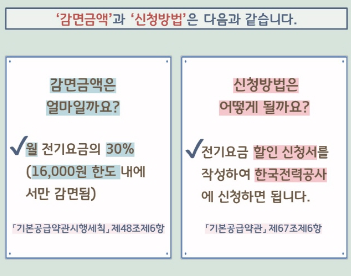 전기요금 할인 지원기준과 신청은 한국전력공사 홈페이지를 통해 하시면 됩니다.