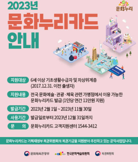 문화누리카드는 문화체육관광부에서 발급하는 전국 공공문화시설을 할인받거나 무료로 이용할 수 있는 카드입니다. 공연, 영화, 전시, 박물관, 도서관 등 다양한 문화시설에서 할인 혜택을 받을 수 있습니다. 문화누리카드를 가지고 있다면 저렴한 가격으로 다양한 문화생활을 즐길 수 있습니다. 문화시설뿐만 아니라 여행, 체육 분야에서도 사용할 수 있으니 활용도도 좋고 사용처도 많습니다.