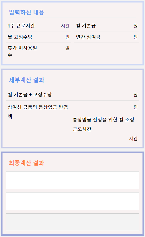 위의 연차수당 계산기를 이용하여 계산하시면 아래의 창처럼 결과가 나옵니다.