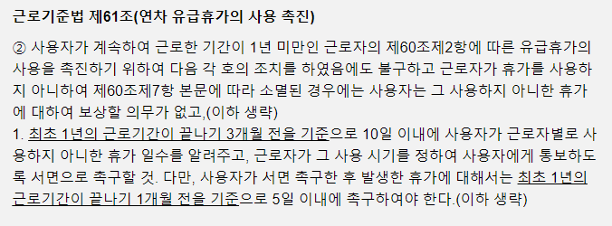 또한 근무 기간에 따라 보장되는 연차휴가 일수도 기업마다 다를 수 있으니 내부 규정을 확인해 보시면 좋습니다.