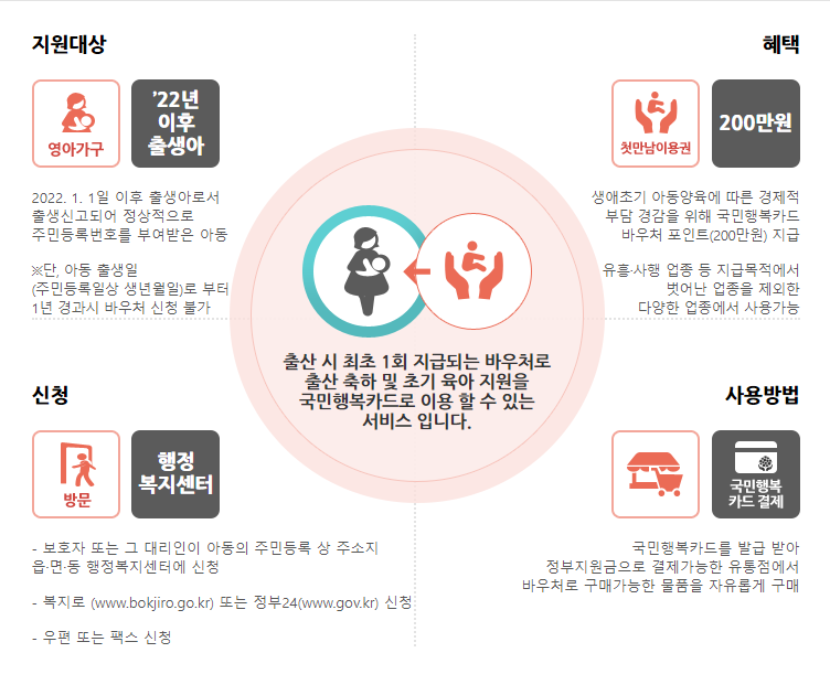 첫 만남 이용권이란, 출산 시 최초 1회 지급되는 국가바우처사업으로, 출산 축하와 육아 지원을 국민행복카드로 지원해 주는 서비스입니다. 최소 200만 원의 혜택을 받을 수 있습니다.