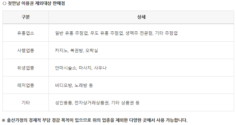 첫 만남 이용권 바우처로는 아동양육에 필요한 물품들을 구입하는 데 사용할 수 있습니다. 특별히 정해진 곳은 없지만, 절대 사용해서는 안 되는 제외 업종들은 꼭 확인하세요!