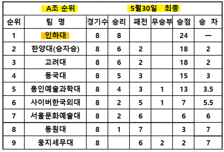 2024년 KUSF U리그 조별 순위는 A조 1위를 기록하였습니다. 그것도 8전 8승의 기록입니다.
